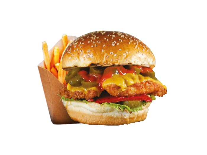 Cheese Chicken Burger İçindekiler:Özel soslar ile marine edilmiş izgara tavuk, peynir, karamelize soğan, turşu,yeşillik, ve patates kızartması ile. Fiyat:120gr 309₺, 180gr 379₺